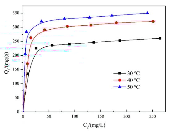 To elucidate the equilibrium states of RhB dye molecules on materials and in liquid surroundings, the adsorption isotherms were conducted []. In particular, WSO-5 was chosen as the model material due to its higher adsorption capacity. The adsorption isotherms of RhB on WSO-5 were carried out at gradient temperatures of 30, 40 and 50 °C. As shown in Figure 8, the adsorption isotherms exhibited conventional L-types with obvious platforms. The results showed that the increasing temperature in circumstance could facilitate the adsorption for WSO-5, suggesting an endothermic adsorption process. Furthermore, a straightforward statistical physics model was utilized to fit the adsorption isotherms of RhB. The mathematical equation of the model is presented as follows []: