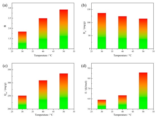 The correlation of the parameters ( and ) of the monolayer can be examined by the variation of the adsorption capacity on the temperature. As shown in Figure 9c, the effect of the temperature on the parameter indicates that the increment of temperature results in an increasing value, which further verifies an endothermic process of RhB adsorption.
