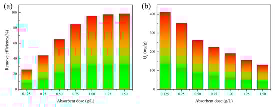 The cost of an adsorbent in practical application depends, to a large extent, on its specific dosage to achieve the wastewater treatment standards. In this work, the correlation of the adsorbent dosage and the removal efficiency of RhB was explored (Figure 10). It can be clearly observed in Figure 10a that the removal efficiency of RhB increases from about 24% to almost 95% as the dosage increases from 0.125 to 1.5 g/L. However, there is no evident growth anymore when the dosage exceeds 1.0 g/L. The reason for this might be that more available binding sites are provided to capture RhB molecules in solution with the increased content of WS2/WO3 composites. To reduce the expense of sewage disposal, an optimal WS2/WO3 dosage of 1 g/L is suggested for the efficient elimination of RhB, with an initial concentration of 200 mg/L at pH 6.0.