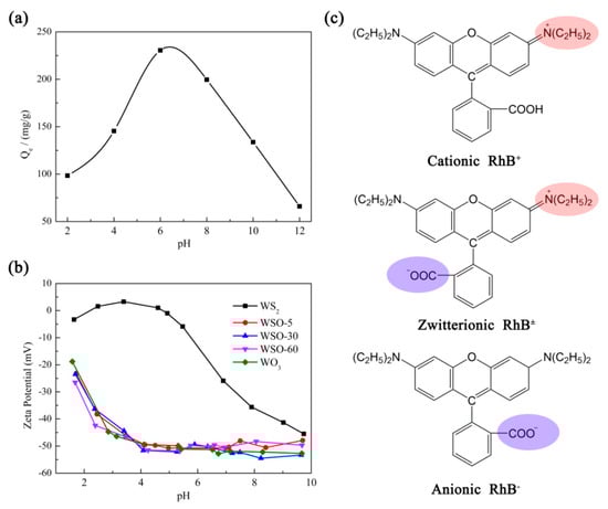 (a) The effect of the pH on the adsorption of RhB on WSO-5. (Adsorbent = 20 mg, RhB = 40 mL of 200 mg/L, T = 30 °C.) (b) The Zeta potential of WS2, WS2/WO3 hybrids, and WO3 at various pH values. (c) The molecular structures of RhB in its zwitterionic, cationic, and anionic form, respectively.