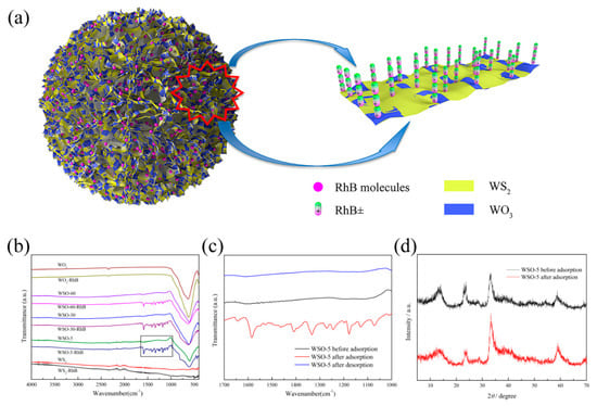 (a) The adsorption mechanism of WSO-5 microflowers toward RhB; (b) the FTIR spectra of WS2, WS2/WO3, and WO3 before and after the adsorption of RhB dye; (c) The enlarged image of WSO-5 of the zone marked in (b); and (d) the XRD patterns of WSO-5 before and after the adsorption of RhB dye.