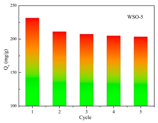 For the practical application of an adsorbent, a quick adsorption rate and high adsorption capacity are of great significance, and the reusability of the adsorbent should be taken into consideration as well. After the adsorption experiments, the adsorbent was washed with ethanol as the eluting agent and reused for the next adsorption process. According to Figure 13, the adsorption performance of WSO-5 toward RhB dye slightly decreased after the first cycle, while remaining almost constant in the following cycles. These results demonstrate that WS2/WO3 has a good stability and can be regenerated and reused efficiently for the treatment of waste water contaminated with RhB dye.