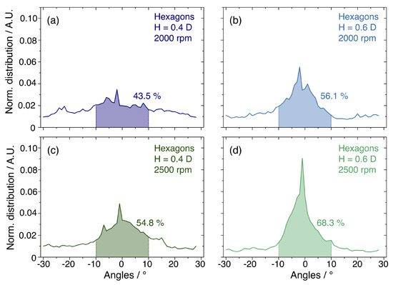 So far, the selection of the optimal self-assembly parameters has been based on a qualitative analysis of the SEM images. To establish the efficiency of the DSA of NSs inside the hexagonal templates in a more rigorous way, the ordering process should be assessed quantitatively. To this goal, the SEM micrographs were processed with a user-defined image-processing routine based on Delaunay triangulation, measuring the orientation of HCP domains. The software recognises the domains and classify them according to their rotations in the angular range between −30° and 30°. The analysis was conducted on the hexagonal templates with H/D ratios of 0.4 and 0.6 highlighted in green in Figure 3. The results are collected in Figure 4, and report the normalised distributions of the orientation of the confined monolayer in different geometrical and dynamic conditions. Such angular distributions are centred on 0° indicating an alignment to the templates edges, while slight deviations in the orientation broaden the distributions. These can be accounted for by calculating the integral of the curve which gives the percent occurrence of the domains in a given orientation range. In the hexagonal templates with H/D ratio of 0.4 and 0.6, spinning speed of 2000 rpm lead to 43.5% and 56.1% of domains with orientation comprised between −10° and 10°, as shown in Figure 4a,b, respectively. In the graphs in Figure 4c,d, the percentage of aligned domains increases to 54.8% and 68.3% when the spin coating speed is set to 2500 rpm for H = 0.4D and H = 0.6D, respectively. This quantitative result clearly highlights that templates with H = 0.6D induce a better ordering of the NSs when deposited at high spinning speed.
