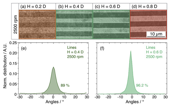 The confinement process was tested also inside linear templates, chosen for its simple realisation by DLW lithography, using the same optimal spinning conditions. The SEM micrographs reported in Figure 5a–d show the outcome of the SA process in the linear templates. Similarly to what was observed for the hexagonal templates, the micrographs coloured in orange (Figure 5a) and red (Figure 5d) correspond to unsuitable conditions for the DSA. Conversely, the templates with H/D ratio of 0.4 and 0.6 promote the formation of a confined self-assembled monolayer, as shown in Figure 5b,c. Also, in this case, the SEM micrographs were processed by Delaunay triangulation to evaluate the ordering process in terms of the domains orientation. The results of this study, reported in the graphs in Figure 5e,f, outline an angular distributions centred on 0° with narrow peaks including 89% of domains in the range from −10° and 10° for H = 0.4D. This percentage rise up to 96.2% inside structures with H = 0.6D.