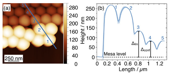 Figure 7a,b reports the AFM micrograph acquired on a linear template and the corresponding height profile, respectively. When the NSs are well confined inside the template (e.g., the NSs labelled as #4 and #5), they lay at the same level for which . By approaching the side walls, the height of the nanospheres increases and NS #3 is separated from the top of the mesa by .