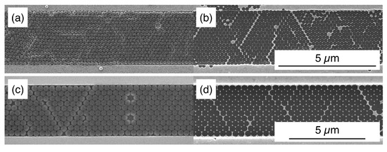 An interesting solution to overcome this limitation is represented by the use of substrate modifications to aid the formation of single-layered crystals of NSs. This approach, also called directed self-assembly (DSA), has been successfully proposed for other self-assembling systems, such as Block Copolymers (BCPs), receiving great consideration so far due to its wide applicability in key technological sectors such as microelectronics [5,6,7]. The substrate can be modified either by a chemical [8,9] or topographic templates generated prior the SA process [10]. In the latter case, the bottom-up SA process is directed by the presence of confining structures such as linear or circular gratings, defined by conventional top-down lithographic approaches [11]. The geometrical dimensions of the topographic templates can be tailored to be commensurate to the characteristic dimensions of the SA material (e.g., diameter of the NSs or center-to-center distance for BCPs).