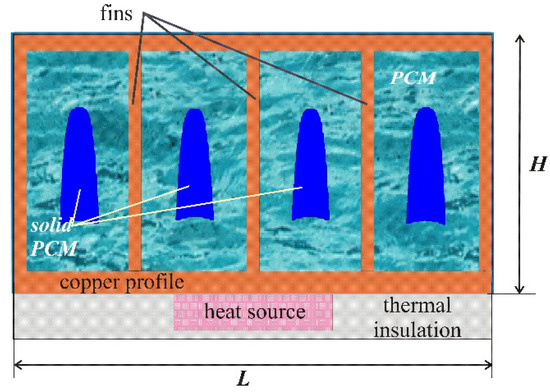 Figure 1 shows the model of the region under consideration, namely, a closed metal rectangular profile with dimensions of L × H, where L = 3.0 cm and H = 1.5 cm, and internal metal fins, between which the PCM enhanced by Al2O3 nanoparticles is located. A rectangular source of constant volumetric heat generation with the properties of silicon with a total power of 400 W per meter length is located under the metal profile.
