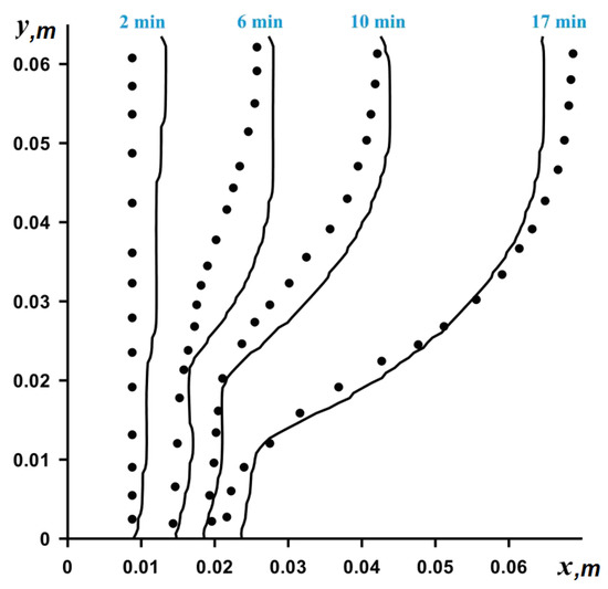 The numerical solution to Equations (8)–(13) was obtained on the basis of the finite difference method [25,26,27,28]. To discretize the convective terms in vorticity (Equation (9)) and energy (Equation (10)), we used the Samarskii monotonic difference scheme, and the diffusion terms in all equations were approximated based on the central differences with a second order of accuracy. The Poisson difference equation for the stream function was solved by the successive over-relaxation method. Samarskii local one-dimensional difference scheme for the approximation of the vorticity and energy equations was applied. Using this described method, the developed computational code was verified, employing the experimental data for the gallium melting. A numerical algorithm was applied in solving the problem of gallium melting in a rectangular region and showed good agreement with experimental results [29] (see Figure 2).