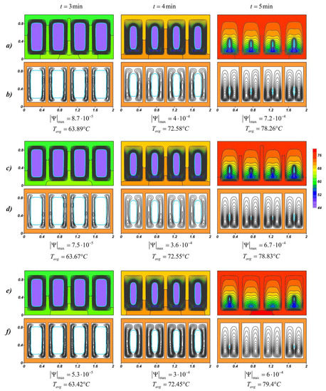 The temperature fields shown in Figure 9 at the time t = 3 min present wide-spaced isotherms in the radiator and more densely located isotherms in the material on the inner surface of the profile, indicating a faster heat distribution in the radiator compared to the nano-enhanced material. When heating solid paraffin wax, before the phase transition, the temperature difference of the source for pure paraffin and paraffin with nanoparticle concentrations of 6% reaches 0.87 °C. When the radiator temperature exceeds 81 °C and the melting process begins, the effect of adding the nanoparticles increases, namely, the temperature difference for pure material and NePCM at Φ = 6% increases to 1.79 °C. After the melt volume reaches 100%, the average temperature of the source grows more rapidly. Due to convective heat and mass transfer, the lowest temperatures are observed in the lower part of the melt region. Moreover, in the case of Φ = 2%, the isotherms in the melt are less condensed to the walls, which indicate a more intense conductive heat transfer, as a result of which the observed Tavg is lower by 1.35 °C at time t = 7 min and at higher mass particle concentrations. An increase in viscosity strongly affects the thermal processes in the system, namely, a 43% decrease in is accompanied by an increase in the average temperature of the source. The average heater temperature at Φ = 6% was only 0.12 °C lower than in the case of pure paraffin and at the same time by 1.23 °C higher than at Φ = 2%. Thus, paraffin with 2 wt % nanoparticles shows the best results. With the disappearance of the unmelted material, the maximum values of the stream function sharply decrease up to two times.