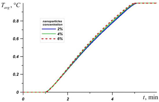 It should be noted that the addition of nanoparticles to the material does not lead to a significant decrease in the heater temperature. In the cases under consideration, at specific points in time, the temperature in the source decreases by no more than 1.5 °C with an increase in the concentration of nanoparticles, which is a relatively small difference in the considered thermal conditions. A high concentration of nanoparticles significantly reduces the intensity of the circulation of the melt, which leads to a decrease in the intensity of heat transfer. At the same time, the material melts faster due to a decrease in latent melting energy. Thus, an increase in the efficiency of the heat sink is observed only at a 2% concentration. At higher concentrations, the heater temperature decreases slightly, or vice versa, which leads to a decrease in heat transfer between the source and the heat sink (Figure 8).