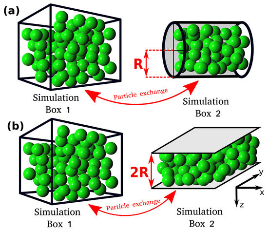 All MC simulations are carried out using an in-house simulation code. The MC simulations consist of two simulation domains, Simulation Box 1 and Simulation box 2 (see Figure 1). Throughout the manuscript the terms Simulation Box 1 and 2 are used to refer to the two domains, however, simulation domain 2 does not correspond to an actual box. The total number of particles in the system, , is fixed and particles can be exchanged between the simulation boxes. Box 1 is cubic and has periodic boundary conditions imposed in all directions. Box 1 represents a bulk fluid. The differential pressure, P, and temperature, T, in Simulation Box 1 are imposed, while the volume, , and the number of particles, , can fluctuate. Simulation Box 2 is a cylinder or a slit pore with a fixed volume . The size of the cylinder and the slit pore are defined by the radius, R, and by the distance between the two parallel planes, , respectively (Figure 1). In Box 2, periodic boundary conditions are applied only in the axial direction for the cylinder and in the x and y directions for the slit pore (see Figure 1). Box 2 represents the confined fluid which has an integral pressure . In Simulation Box 2, the volume, , and temperature T are imposed, while the number of particles can fluctuate by exchanging particles with Box 1. The instantaneous integral pressure fluctuates, and by definition [20] its ensemble average, , will be equal to P only for macroscopic systems (). The ensemble used is a variation of the -Gibbs ensemble [21]. The main difference between the ensemble used in this work and the conventional -Gibbs ensemble is that in our simulations the volume of Box 2 is fixed [21]. Essentially, Box 2 corresponds to the grand canonical ensemble with the reservoir explicitly modeled in Box 1. This computational setup was also used in other studies, i.e., A. Z. Panagiotopoulos et al. [21], P. Bai et al. [22], etc.