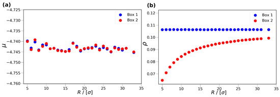 In the MC simulations, three types of trial moves are used: translation, volume change, and particle exchange. The translation and particle exchange trial moves are used in both simulation boxes, while volume change trial moves are only performed in Simulation Box 1. The acceptance rules of the trial moves can be found elsewhere [23]. The particle exchange trial move, ensures that Box 1 and Box 2 are in chemical equilibrium, i.e., the chemical potentials of the two boxes are equal (). The chemical potentials of the boxes are defined as the sum of the ideal and excess chemical potentials of the fluid in the respective box (). The ideal gas chemical potentials () are calculated based on the density and temperature of the fluid. The excess chemical potential () can be calculated using different methods, i.e., Widom’s test particle insertion method [23], Contionous Fractional Component Monte Carlo method [24,25], Bennet acceptance ratio method [26], etc. Although the Bennet acceptance ratio method is computationally more efficient than the Widom’s test particle insertion method, the Widom’s test particle method is sufficient for the systems considered in this study. Separate simulations are carried out using different cylinder radii R, while imposing (in reduced units) in Box 1. In Figure 2, the chemical potential of Box 1 and Box 2 (Figure 2a), as well as the density of Box 1 and Box 2 (Figure 2b), are shown as a function of the cylinder radius at . As can be seen from Figure 2a, the chemical potentials of Box 1 and Box 2 are equal within the uncertainties of the simulations.