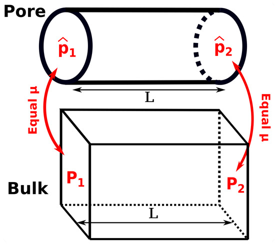 Schematic representation of a bulk fluid in equilibrium with a nanoconfined fluid in a pore. The concept of the ratio of driving forces for mass transport, , can be introduced based on the definition of ratio of driving forces in the two systems, and .