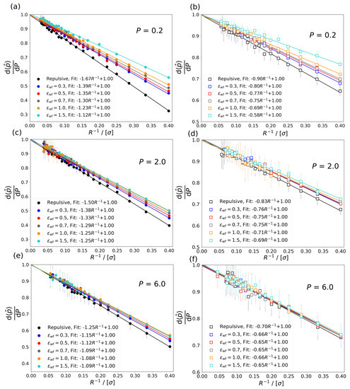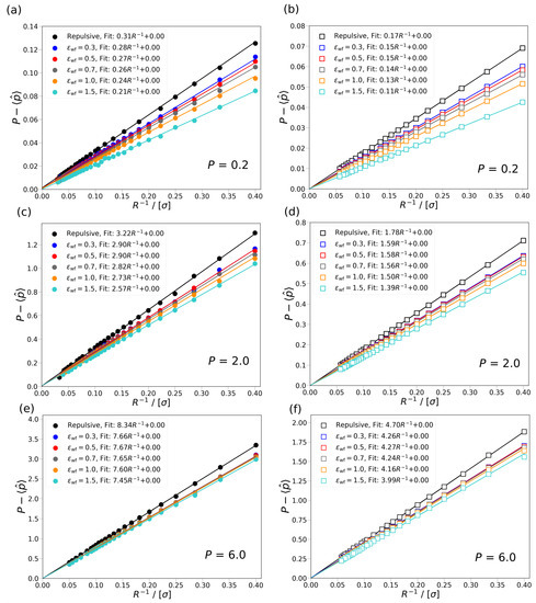 The difference between the differential, P, and the ensemble average of integral pressure, , is shown as a function of the inverse radius of Box 2 at 0.2, 2.0, and 6.0 for cylindrical and slit pores with fluid-wall interactions. (a,c,e) The pressure difference is shown for cylindrical pores at differential pressure 2.0, and 6.0, respectively. (b,d,f) The pressure difference is shown for slit pores at differential pressure 2.0, and 6.0, respectively. The simulation results are shown with symbols, while the lines are fits to the data points. The equation used for the fitting is , where A and B are constants. The colors denote the different level of attraction between the wall of Box 2 and the fluid, repulsive wall potential (black), 0.3 (blue), 0.5 (red), 0.7 (gray), 1.0 (orange), and 1.5 (cyan). The results for the cylindrical pore are shown with closed circles and for the slit pores with open rectangles. The temperature of both boxes is set to . The average densities of Box 1 are 0.10, 0.58, and 0.8 at 0.2, 2.0, and 6.0, respectively.