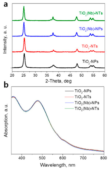 The following are available online at https://www.mdpi.com/2079-4991/10/2/296/s1, Figure S1: (a) Reflectance of NTs and NPs powders. (b) Absorption spectra of NTs and NPs films; Figure S2: (a) Valence band XPS spectra of TiO2(Nb)-NPs and TiO2(Nb)-NTs layers. (b) PL spectra of TiO2(Nb)-NPs and TiO2(Nb)-NTs layers taken at 10 K; Figure 3: SEM micrographs of (a) TiO2(Nb)-NPs and (b) TiO2(Nb)-NTs; Table S1: The ratios of the emission intensity of O pπ to O pσ orbitals for Nb-doped NPs and NTs.