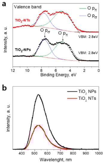 The energy distribution curves of photo-emitted electrons reflect the valence band density of states (Figure 2a). The electron emissions from O pπ (non-bonding) and O pσ (bonding) orbitals are observed in a range of 3–10 eV [10,29]. The results of the deconvolution analysis of the valence band spectra for NPs and NTs films are shown in Figure 2a. The peaks centered at 5.2 eV (solid lines) are attributed to the electron emission from O pπ orbitals, while peaks at 7.4 eV (solid lines) are assigned to the electron emission from O pσ orbitals. The ratios of the emission intensity of O pπ to O pσ orbitals were found to be of around 1.5 and 2.3 for NPs- and NT-based layers, respectively. A similar behavior was demonstrated for Nb-doped electrodes (Figure S2, Supplementary Materials).
