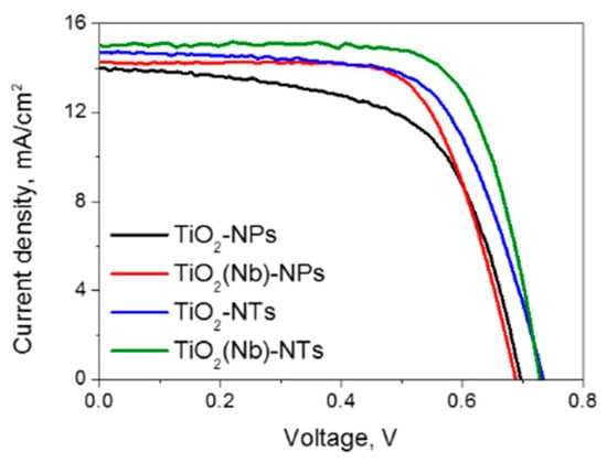 We have fabricated several sets of devices with pristine and Nb-doped TiO2 NPs and pristine and Nb-doped NTs. The PV parameters of 5–8 solar cells of each type were investigated. The current density-voltage (J-V) curves of best performing DSCs are shown in Figure 4 and Table 1 lists the values of the open-circuit voltage (VOC), the short-circuit current density (JSC), the fill factor (FF) and the PCE. We used both pristine and 2% Nb-doped NPs- and NTs-based layers as photoelectrodes since it is known that Nb doping in this concentration is favorable for improving charge transfer efficiency in the DSCs [8]. At the same time, we found that the Nb doping does not affect the morphology of NPs either the NTs morphology (Figure S3, Supplementary Materials).