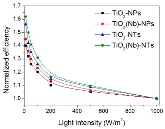 Normalized efficiency of pristine and Nb-doped TiO2 NPs- and NTs-based DSCs operated under various light intensities.
