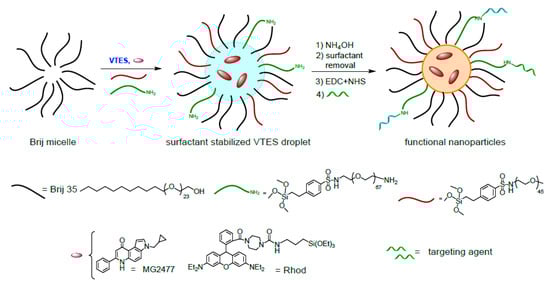 The synthesis of PEGylated ORMOSIL nanoparticles (NPs) is summarized in Figure 1 [49,50]. The process requires the polymerization of vinyltriethoxysilane catalyzed by ammonia as base, in an aqueous solution containing the surfactant Brij 35. The surfactant favors the pre-organization of the NP components and monomers, which locate themselves in different NP regions depending on their solvophilicity. Hydrophobic species, such as dyes, drugs, and VTES, locate in the NPs core, where the polymerization reaction condense them to form the ORMOSIL matrix. Organic species result entrapped or chemically grafted to the ORMOSIL network, depending on the presence or absence of reactive silane groups in their structure. Surfactants and amphiphilic species locate on the NPs surface, interacting with both the core and the surrounding solution.