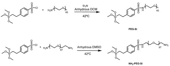 PEG derivatives PEG-Si and NH2-PEG-Si (Figure 1) used to coat the ORMOSIL NPs were obtained by a Hinsberg reaction of the corresponding PEG amine with 2-(4-chlorosulfonylphenyl) ethyltrimethoxysilane (Figure 2) [49,50]. Products can be used without purification or after precipitation with tert-buthyl methyl ether. In the case of NH2-PEG-Si, a small fraction of bi-functionalized derivative (bearing two silane moieties) can be present, but this does not affect the properties of the nanoparticles [49,50].