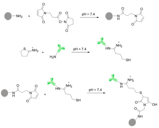The conjugation of the NH2-NPs with the anti-CD44v6 antibody (Ab-CD44v6) was obtained by the thiol-maleimide chemistry, introducing maleimide moieties in the nanoparticles and thiol groups in the antibody (Figure 3). The antibody was reacted with 2-iminothiolane (2-IT) in a 1:7 Ab-CD44v6/2-IT ratio to introduce about 2-4 sulfhydryl groups per protein. Functionalization was confirmed by the Ellman test [64,65]. NH2-NPs nanoparticles were reacted with 3-(maleimido) propionic acid N-hydroxysuccinimide ester (MBS). Purification was performed by ultrafiltration with membranes with a 10 kDa cut-off. The successful conversion of the amino groups of NH2-NPs in maleimide groups was verified with the fluorescamine test that confirmed the decrease of the amount of NH2 groups in the nanoparticles’ coating. The conjugation of the maleimide-NPs with the antibody was performed by incubating them in different ratios at RT for 48 h in PBS. Two different batches of conjugated NPs were prepared using 10-fold different amounts of antibody (1× and 10×, Section 2.1.5, Table S2). The so-obtained Ab-CD44v6-NPs were purified by ultrafiltration. As control, conjugation of human serum albumin (Alb) with NH2-NPs was performed. Alb was functionalized by reaction with 2-IT, followed by the conjugation with maleimide-NPs under the same conditions as the antibody conjugation.
