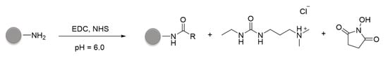 N-(3-Dimethylaminopropyl)-N′-ethylcarbodiimide hydrochloride (for 11.5 kDa HA, 30.8 mg, 0.16 mmol; for 22.5 kDa HA, 15.4 mg, 0.08 mmol) and N-hydroxysuccinimide (for 11.5 kDa HA, 9.2 mg, 0.0.08 mmol; for 22.5 kDa HA, 4.6 mg, 0.04 mmol) in 1 mL ultrapure water were added to a solution of HA (11.5 kDa HA, 8.8 mg, 7.8 × 10−4 mmol. 22.5 kDa HA, 17.6 mg, 7.8 × 10−4 mmol) in HEPES buffer (1 mL, 10 mM, pH 6). The mixture was stirred for 30 min for the activation of HA (1.8 mL, 1× conjugation; 0.2 mL, 10× conjugation), and then 2 mL of 4.29 mg/mL NH2-NPs were added to each reaction vessel. After overnight stirring, the nanoparticles were filtered through a 0.45 µm membrane filter, pelleted by centrifugation, and resuspended with 5 mL ultrapure water (23,500× g, 30 min, 3 times) and then with PBS 1 mM (23,500× g, 30 min) and stored at 4 °C.