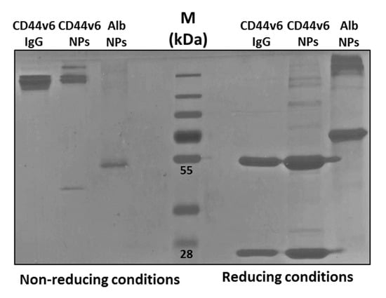 Protein conjugation could be demonstrated by SDS-PAGE analysis in reducing conditions, i.e., treatment with heat and β-mercaptoethanol. This caused the detachment of part of the antibody from the NPs, due to the breaking of the disulfide bridges, allowing the antibody to run along the polyacrylamide gel (Figure 6). In the absence of reducing agents, neither free Ab-CD44v6 nor free Alb were detected in the electrophoretic run. However, in reducing conditions, bands corresponding, respectively, to the detached antibody heavy and light chains could be observed. This confirmed that proteins were covalently bound to the NPs and could be detected only when the maleimide-thiol bond was cleaved [66].