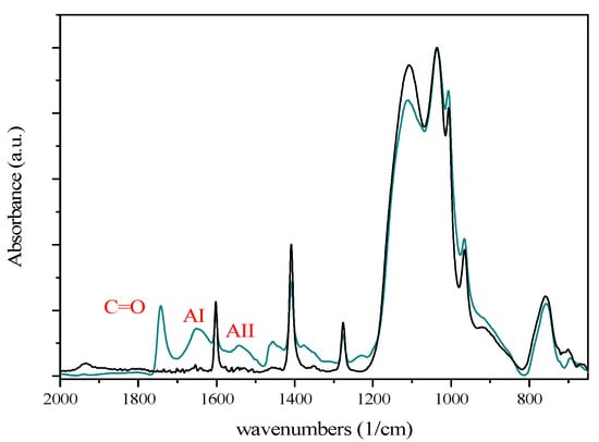 Infrared spectra were recorded on a low-e microscope slide (Kevley Technologies, Chesterland, Ohio, OH, USA). Once the solvent evaporated, the spectra were collected by means of a Nicolet is 10 spectrometer (Thermo Fisher Scientific, Waltham, MA, USA) coupled to a Spectra Tech Continuum optical microscope (Spectra Tech Inc., Oak Ridge, TN, USA). The spectra (64 scans) were acquired in reflection mode, in the 4000–650 cm−1 range, with a resolution of 4 cm−1.