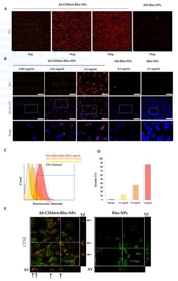 Binding and internalization of Ab-CD44v6-Rho-NPs in HEK-293A-CD44v6: (A) Concentration-dependent binding of Ab-CD44v6-Rho-NPs to HEK-293A-CD44v6. Cells were incubated with NPs for 1 h at room temperature (RT) and then washed multiple times to eliminate unbounded NPs; Rho signal (in red); magnification 10×. (B) Up-take of different concentrations of Ab-CD44v6-Rho-NPs and of controls, human Albumin conjugated NPs (Alb-Rho-NPs), and unconjugated NPs (Rho-NPs) in HEK-293A-CD44v6; cells were incubated with NPs for 4 h at 37 °C and then washed multiple times to eliminate excess of NPs; DAPI (4′,6-diamidino-2-phenylindole) nuclear staining shown in blue, Rho signal in red; scale bars: 100 µm. (C,D) Analysis of cellular uptake of Ab-CD44v6-Rho-NPs in HEK-293A-CD44v6 by fluorescence-activated cells sorting (FACS). Cells were incubated with NPs for 4 h at 37 °C, washed multiple times, and fixed. Overlay of histograms (C) representative of different experiments performed with the Isotype (Rho-NPs) and different concentrations of Ab-CD44v6-Rho-NPs and (D) mean percentage of internalized NPs in HEK-293A-CD44v6: the results are shown for each concentration condition as mean percentage ±SD of experiments performed in triplicates. (E) Z-stack analysis of the internalization of Ab-CD44v6-Rho-NPs, compared to unconjugated Rho-NPs, in HEK-293A-CD44v6. A CFSE cell tracer was used to stain the cytoplasm (in green). Dotted lines represent the section in the axial plane corresponding to the frontal (XY) and sagittal (YZ) planes. Black arrows show Rho signal in correspondence to the CSFE signal in frontal and sagittal planes. Scale bars: 47.62 µm.