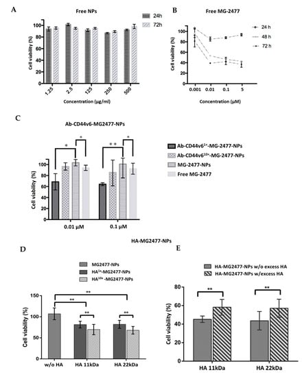 Cytotoxicity analysis of Ab-CD44v6-MG2477-NPs and HA-MG2477-NPs in HeLa-CD44v6 cells. (A) Analysis of the cytotoxicity of unconjugated and unloaded NPs (free NPs) by MTT assay. Unconjugated and unloaded NPs were incubated with cells at 37 °C for 4 h, after which the cells were washed to eliminate non-internalized NPs. At 24 and 72 h post-treatment, MTT assay was performed to measure cell viability. (B) Analysis of the cytotoxicity of free MG2477 by MTT assay. Cells were treated with free MG2477 for 24, 48, and 72 h, after which MTT assay was performed to measure cell viability. (C) Analysis of the cytotoxicity of Ab-CD44v6-MG2477-NPs loaded with MG-2477 and used to treat cells at two different concentration of drug (0.01 and 0.1 µM). NPs Ab-CD44v610x-MG2477-NPS and Ab-CD44v61x-MG2477-NPs, conjugated with a greater or a lower amount of antibody (ratio of NPs/antibody 1:10 and 1:1, respectively) were incubated with cells at 37 °C for 4 h, after which cells were washed to eliminate non-internalized NPs. At 72 h post-treatment, MTT assay was performed to measure cell viability; * p ≤ 0.05; ** p ≤ 0.01. (D) Analysis of the cytotoxicity of HA-MG2477-NPs, conjugated to two different molecular weights of HA (11.5 and 22.5 kDa) and to two different amount of HA (ratio of NPs/HA 1:10 and 1:1, respectively, HA10x-MG2477-NPs and HA1x-MG2477-NPs,), and used at a drug concentration of 0.1 µM. NPs were incubated with cells at 37 °C for 4h, after which cells were washed to eliminate non-internalized NPs. At 72 h post-treatment, MTT assay was performed; ** p < 0.01. (E) Competition assay of HA-MG2477-NPs conjugated to two different molecular weights of HA (11.5 and 22.5 kDa) used at a drug concentration of 0.1 µM and pretreated with an excess of HA. Cells were incubated for 1 h at 37 °C with (w/) or without (w/o) excess of HA (10 mg/mL in DMEM medium), washed, and then incubated with for 4 h. At 72 h post-treatment, cells were analyzed by the MTT assay; ** p < 0.01. The graphs shown represent the mean percentage of cell survival ±SD of experiments performed in triplicates. For statistical analysis, a Student’s T test was applied.
