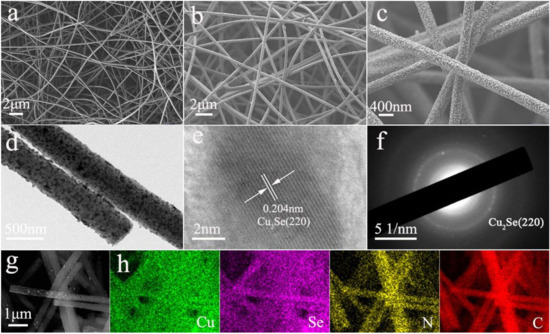 (a) SEM image of Cu(AC)2/PAN electrospun nanofibers; (b,c) SEM and (d) TEM images of Cu2Se-NC nanofibers after selenization treatment; (e) HRTEM image of Cu2Se-NC nanofibers. (f) Selected-area electron diffraction patterns of Cu2Se-NC nanofibers. (g) SEM image and (h) corresponding elemental mappings of Cu, Se, N, and C of Cu2Se-NC.