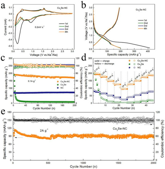 (a) Cyclic voltammograms of the Cu2Se–NC for the initial four cycles; (b) Charge/discharge curves of the Cu2Se–NC; (c) Cycling performance and of the Cu2Se–NC and Cu2Se and NC at 0.1 A g−1; (d) Rate capability of the Cu2Se–NC at various current densities; (e) Long cycling performance of the Cu2Se–NC at 2 A g−1.