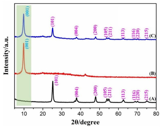 - Li, C.; Zhang, S.; Zhou, Y.; Li, J. A situ hydrothermal synthesis of a two-dimensional MoS2/TiO2 heterostructure composite with exposed (001) facets and its visible-light photocatalytic activity. J. Mater. Sci. Mater. Electron. 2017, 28, 9003–9010. [Google Scholar] [CrossRef]