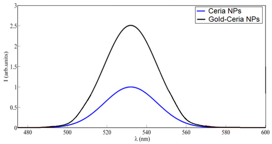 Emission intensity spectrum of both ceria nanoparticles (NPs) only and gold–ceria NPs under 430 nm excitation.