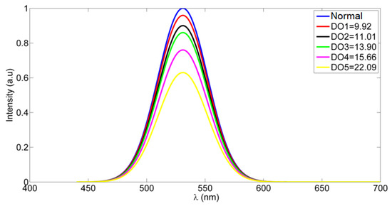 Depending on the results from Figure 3, the relative intensity versus the concentration of added DO is plotted in Figure 5. The relative intensity is calculated using the Stern–Volmer equation [11]: