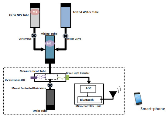 The main process of the designed prototype relies on optical sensor components, which are a UV LED, cuvette, and green optical sensor. Such elements are integrated on a small isolated tube. This tube is connected to another two tubes (ceria NPs and the tested water) to perform measurements and analysis. The ceria NPs and the tested water are mixed together into the mixing tube and feed this mixture to the optical sensor tube. On the other hand, another two valves are used to feed this mixing tube. The first valve is used to pull ceria NPs that exists in another third tube with a shaking system to the mixing tube, while the other valve is used to pull the required tested water to the same mixing tube. After all measurements have been performed, the user has to press the push button to drain the tested sample and start a new test with fresh samples.