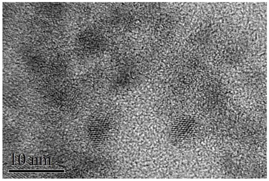 Colloidal AgxBi1−xS2 NP thin films were synthesized by a hot-injection low-temperature approach [1]. In this method, 0.8 mmol of silver acetate and 1 mmol of bismuth acetate are reacted with oleic acid; then, 1 mmol of bis (trimethylsilyl) sulfide (TMS) diluted with octadecene is injected into silver-bismuth oleate solution at 100 °C to form the AgBiS2 nanocrystals. To synthesize AgxBi1−xS2 NPs with four different x values, we adjusted the amount of silver precursor introduced into the reaction flask, keeping the other parameters of the reaction constant. Energy-dispersive X-ray (EDX) spectra acquisition and analysis were performed with a Helios Nanolab 600 (FEI Company) microscope combined with an X-Max detector and INCA® system (Oxford Instruments). High-resolution transmission electron microscopy (TEM) measurements were performed at the Scientific and Technological Centers of the University of Barcelona (CCiT-UB). TEM micrographs were obtained using a JEOL 2100 microscope operating at an accelerating voltage of 200 kV. The samples were prepared by drop-casting a toluene-based colloidal NP solution on a holey carbon-coated grid. TEM (Figure 1) indicated an average size of 3.5–4 nm; the particles tended to show oval projections, not perfectly rounded, with a short axis of about 3 nm and a long axis of 4–5 nm; the thickness for all samples was ~100 nm. The correspondence between sample code and Ag concentration is summarized in Table 1, in which we report the reaction precursor ratio and values measured by EDX.