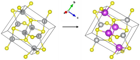(Left): Monoclinic structure of Ag2S (● Ag ● S); the two inequivalent Ag sites are labelled I and II. (Right): Substitution of the second Ag site with ● Bi.