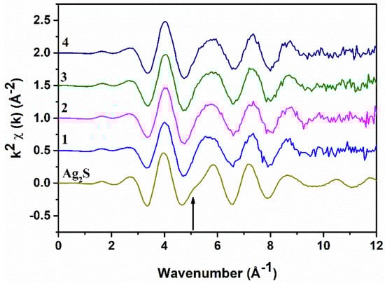 The most important numerical results of the fit are reported in Table 3. We note that the Ag–S bond length is in the range of 2.48–2.51 Å, which is compatible with a low S coordination number in the first shell as in monoclinic acanthite and not with a high coordination site as in cubic schapbachite or hexagonal matildite [31]. This is a further confirmation that the local structure has features similar to those of the monoclinic phase. Furthermore, as shown in the Supplementary Material, the Bi LIII edge EXAFS spectra were fitted using the same model, albeit only in the first shell, and the results are reasonably compatible with the Ag K-edge results. Figure S4 reports the FT and fit for a Bi2S3 reference sample and Figure S5 the FTs and fits for the samples.