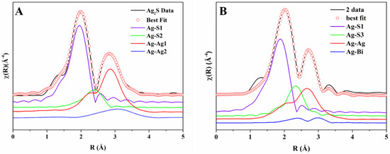 The background-subtracted Ag K-edge EXAFS spectra of all samples and of Ag2S are shown in Figure 3: They are all very similar and resemble the Ag2S spectrum. The main difference is the absence of a shoulder at ~5.1 Å−1 in the samples (indicated by the arrow); presumably, this is due to the presence of Bi in the local coordination around Ag. The Fourier Transforms (FTs) of the EXAFS spectra, performed in the range of 2.0–10.5 Å−1 of Ag2S and sample 2, which are also quite similar, are shown in Figure 4 as black continuous lines. The XANES spectra at the Ag K-edge is somewhat featureless because of the core–hole broadening. The experimental spectra of the samples and Ag2S are reported in the Supplemental Material (Figure S1) and also show similarities. We also report (Figure S2) a comparison between the experimental spectrum and FDMNES simulations for the schapbachite (cubic), acanthite (monoclinic), and matildite (hexagonal) bulk phases. There are similarities of the experimental spectrum with the hexagonal and monoclinic phases, but it is not possible to draw firm conclusions from these simulations, also because of the core–hole broadening.