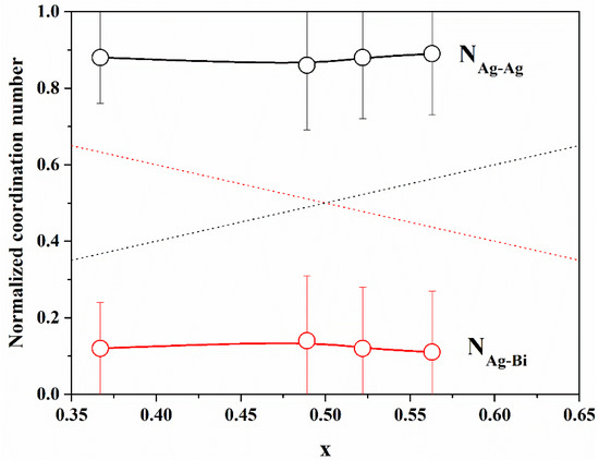 In Figure 5, we report the normalized Ag–Ag and Ag–Bi coordination numbers, as defined above, with the Ag concentration x. It is evident that NAg−Ag is always greater than x and NAg−Bi is always smaller than 1 − x, indicating that there is a tendency for cation ordering (i.e., clustering of similar cations). In order to quantify the degree of cation ordering, we calculated the Cowley [32,33] short-range order parameter, defined as