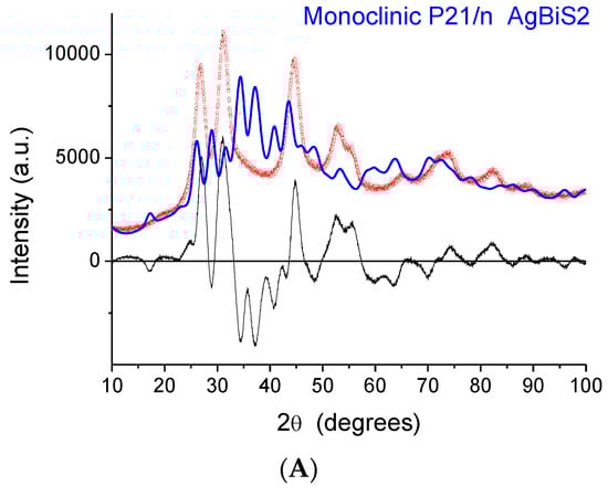 X-ray diffraction measurements were performed using a PANalytical X’Pert PRO MPD Alpha1 powder diffractometer with Cu Kα radiation (λ = 1.5406 Å, 45 kV–40 mA) in the Scientific and Technological Centers of the University of Barcelona (CCiT-UB). The samples were prepared by drop-casting a concentrated dispersion of AgxBi1−xS2 NPs onto a clean glass slide. The XRD patterns were analyzed with the TOPAS software for structural refinement [19], version 7, using the functions recently developed for the analysis of nanocrystalline powders [20]. Different structures were implemented in the refinement to assess the degree of matching to the experimental data. Structural information on standard phases was taken from the “materials project” web interface [21]. In addition, to fit quality and structural information, data analysis provides the crystalline domain size, assuming spherical shape with a lognormal distribution of diameters, and inhomogeneous strain (also referred to as microstrain). Details on the procedure are reported elsewhere [20,22].