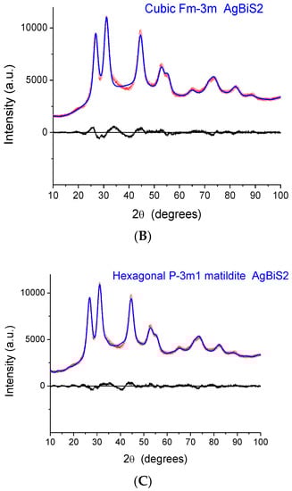 Comparison of the experimental XRD pattern for sample 2 (red points) with simulations (blue line) based on the acanthite (A), schapbachite (B), and matildite (C) structures. The difference between the experimental data and model (residual) is shown below (black line).