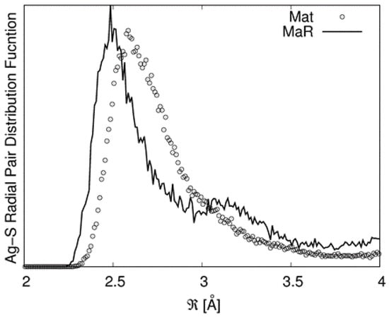 Ab initio DFT and MD simulations provide original insight to solve this contradiction. Analysis of the DFT-relaxed structures of the model compounds (acanthite, Bi2S3, and S) revealed an accuracy in the determination of the (Ag, Bi)-S distances of 1% with respect to experimental values and will not be discussed here. Table 4 reports some data retrieved from the static DFT (formation energy) and DFT−MD (structure) modelling of candidate structures to be considered for the interpretation of the XAFS data. An image of the structure resulting from the DFT−MD simulations is reported in Figure S6. The results of the formation energy confirm the observation of Viñes et al. [6] that matildite is more stable than schapbachite. However, these values should be considered just from a qualitative point of view as they are relative to a 0 K calculation and to a specific equilibrium configuration. Due to the complex environments around the cations involving many sites, structural data were derived from the first peak of the partial radial pair distribution functions (PRPDFs) obtained from the MD runs. In particular, the first peaks in the Ag−S and Ag−Ag PRPDFs were fitted with two Gaussians and the results are presented in Table 4.