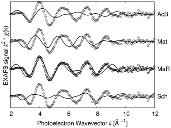 Comparison between experimental EXAFS spectrum of sample 2 (open circles) and simulated ones (continuous lines) based on four candidate structures: Bi-substituted acanthite (AcB), matildite (Mat), matildite with random cation occupation (MaR), and schapbachite (Sch).