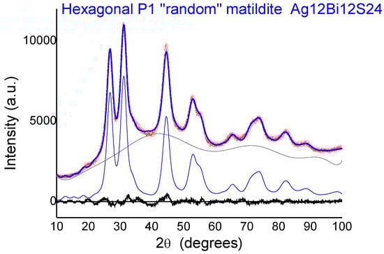 It must be noted that in the random matildite structure, “short” Ag–S bonds appear. This is illustrated in Figure 7 in which the PRPDFs of matildite and random matildite are compared. EXAFS spectra were calculated based on the MD simulations, as described in the previous section; in Figure 8, we report the comparison between the experimental spectrum of sample 2 and the simulations for the four candidate structures: Bi-substituted acanthite (AcB), matildite (Mat), matildite with random cation occupation (MaR), and schapbachite (Sch). It is clear that the only candidate structure for which there is a good comparison in terms of overall lineshape is the random matildite one. As a final check, atomic coordinates from the DFT–MD simulations were used to simulate the XRD patterns, and the result is reported in Figure 9. Here, the hexagonal structure of Ag12Bi12S24 random matildite was mapped in the P1 space group, and the lattice parameters of the 2a, 2b, c supercell were refined starting from values for the standard hexagonal phase (a = b ≠ c, α = β = 90°, γ = 120°). The best fit shows a visible improvement with respect to the standard matildite of Figure 6C, with the statistical quality index Rwp decreasing from 3.05 to 2.55, and a corresponding improvement in the goodness of fit (GoF) from 2.01 to 1.72 [34]. Unit cell parameters change slightly from the starting hexagonal values to: a = 0.8119(5) nm, b = 0.8127(5) nm, c = 1.9735(10) nm, α = 91.0(1)°, β = 90.2(1)°, and γ = 119.1(2)°. The domain size is <D> = 3.1(3) nm, with distribution s.d. = 1.1(2) nm, values not far from the modelling of Figure 6 and TEM observations (cfr. Figure 1). The inhomogeneous strain is small but measurable (~0.0003), and is likely due to the surface relaxation commonly observed in nanocrystals [22,35]. The fact that random matildite is the preferential structure in the synthesized AgBiS2 nanocrystals, as revealed by our results, may have consequences in key properties relevant to the photovoltaic performance of this material, such as the electronic structure and the energy band gap. Revision of previously reported hybrid DFT calculations (which were done with the pure matildite structure) [6] would bring further insight to evaluate the impact of the found distortions. Although dramatic changes are not expected, such variations could explain the moderate mismatch between theoretical and experimental data.