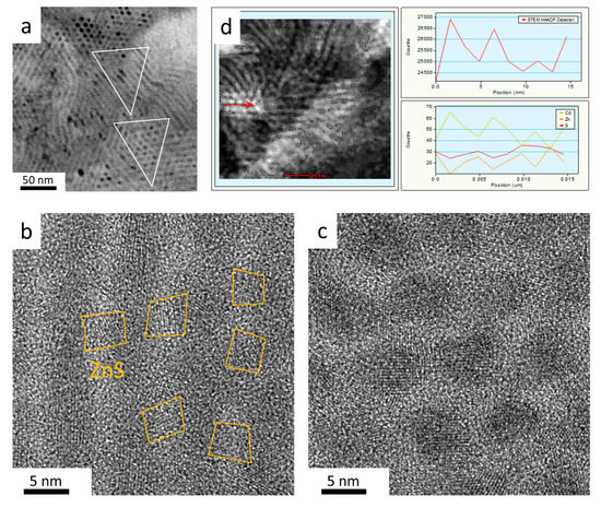 The high resolution TEM (HRTEM) image of selected areas in Figure 2a shows the existence of ZnS between CdSe/CdS QRs (Figure 2a–c). Some of the ZnS particles are marked with the yellow frame in Figure 2b. This shows that the CdS QRs are interconnected by randomly distributed ZnS particles, forming a matrix rather than a simple assembly. Figure 2c shows the ZnS growth around the CdSe/CdS QRs. Instead of growing into a uniform thick shell, the ZnS on the CdS surface grow with an irregular shape and act as a bridge to crosslink CdSe/CdS QRs. The QRs in the QRAs also show a more irregular surface compared to the pristine QRs, suggesting a slight reconstruction of the surface. The surface reconstruction could help to release the lattice stress and stabilize the ZnS growing on the surface. Figure 2d displays the HAADF-STEM element characterization of the selected line in the image. The result shows the high Zn proportion between CdS QRs, proving the growth of ZnS within the QRs. The result meets the observations shown in Figure 2c.