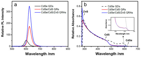 (a) Photoluminescence (PL) spectra and (b) UV-Vis absorption spectra of the CdSe QDs, CdSe/CdS QRs, and CdSe/CdS/ZnS QRAs.