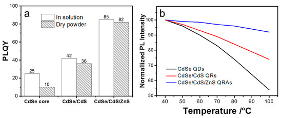 (a) Photoluminescence quantum yield (PLQY) of the CdSe QDs, CdSe/CdS QRs, and CdSe/CdS/ZnS QRAs in solution and in dry powder form; (b) fluorescent quenching of the materials at different temperatures.