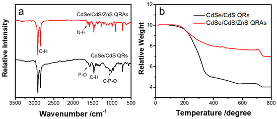 (a) FTIR spectra and (b) TG results of the CdSe/CdS QRs and CdSe/CdS/ZnS QRAs.